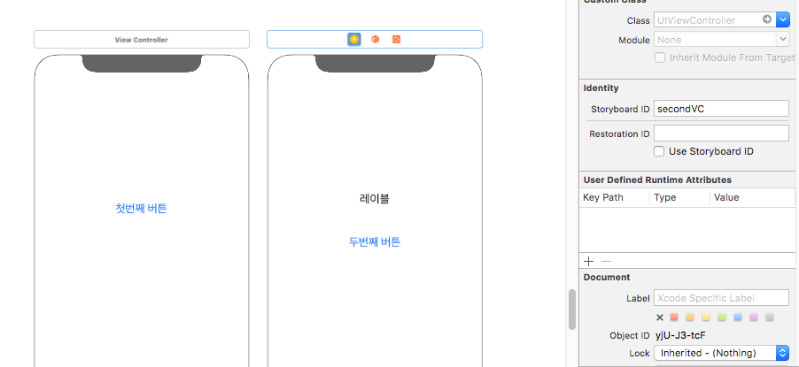 상황은 이렇습니다. 첫번째 뷰에서 버튼 클릭 시 두번째 뷰로 넘어가고, 두번째 뷰의 레이블에 첫번째 버튼 텍스트가 입혀집니다.