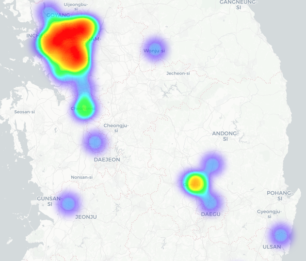히트맵이란, 일종의 밀도를 시각화해주는 맵으로 보시면 됩니다. 어느 지역에 좌표들이 밀집되어 있는지를 잘 표현해주는데요. 코드는 다음과 같습니다.