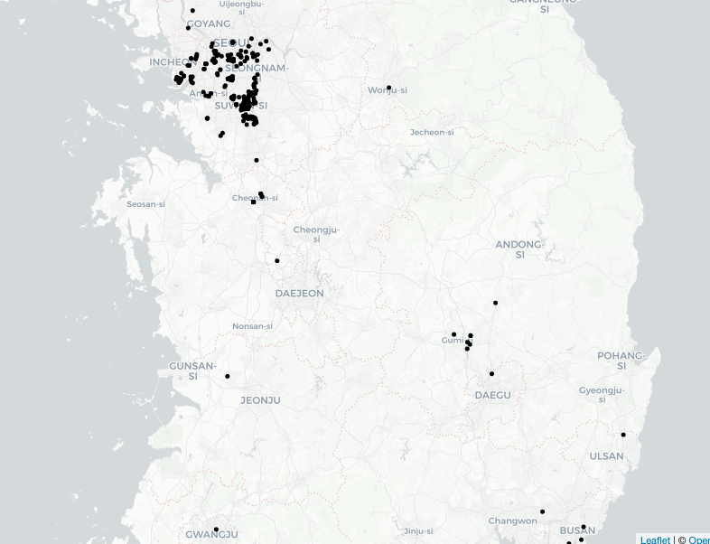 1 2 3 4 5 6 7 8 9 10 11 12 13 14 15 | m = folium.Map( location = [36.5053542, 127.7043419], zoom_start = 8, tiles = 'Cartodb Positron' ) for i in range(len(latlon)): folium.Circle( location = latlon[i], radius = 50, color = '#000000', fill = 'crimson', ).add_to(m) m.save('map.html') | cs |