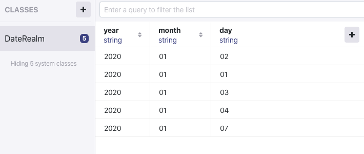 1 2 3 4 5 6 7 8 9 10 11 12 13 14 15 16 17 18 19 20 21 22 23 24 25 26 27 | Results<DateRealm> <0xdd> ( [0] DateRealm { year = 2020; month = 01; day = 02; }, [1] DateRealm { year = 2020; month = 01; day = 01; }, [2] DateRealm { year = 2020; month = 01; day = 03; }, [3] DateRealm { year = 2020; month = 01; day = 04; }, [4] DateRealm { year = 2020; month = 01; day = 07; } ) | cs |