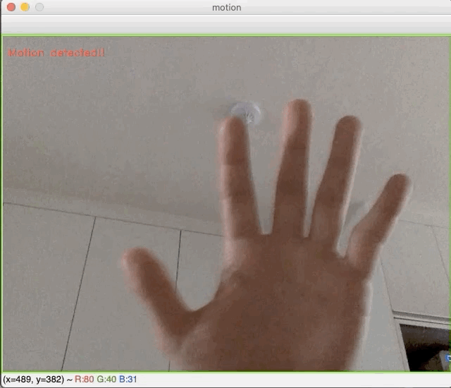 1 2 3 4 5 6 7 8 9 10 11 12 13 14 15 16 17 18 19 20 21 22 23 24 25 26 27 28 29 30 31 32 33 34 35 36 37 38 39 40 41 42 43 44 45 46 47 48 49 50 51 52 53 | import cv2 import numpy as np thresh = 25 max_diff = 5 a, b = None, None cap = cv2.VideoCapture(0) cap.set(cv2.CAP_PROP_FRAME_WIDTH, 600) cap.set(cv2.CAP_PROP_FRAME_HEIGHT, 400) if cap.isOpened(): ret, a = cap.read() while ret: ret, b = cap.read() if not ret: break a_gray = cv2.cvtColor(a, cv2.COLOR_BGR2GRAY) b_gray = cv2.cvtColor(b, cv2.COLOR_BGR2GRAY) diff1 = cv2.absdiff(a_gray, b_gray) ret, diff_t = cv2.threshold(diff1, thresh, 255, cv2.THRESH_BINARY) k = cv2.getStructuringElement(cv2.MORPH_CROSS, (3, 3)) diff = cv2.morphologyEx(diff_t, cv2.MORPH_OPEN, k) diff_cnt = cv2.countNonZero(diff) if diff_cnt > max_diff: nzero = np.nonzero(diff) cv2.rectangle(b, (min(nzero[1]), min(nzero[0])), (max(nzero[1]), max(nzero[0])), (0, 255, 0), 2) ''' rectangle: pt1, pt2 기준으로 사각형 프레임을 만들어줌. nzero: diff는 카메라 영상과 사이즈가 같으며, a, b프레임의 차이 어레이를 의미함. (min(nzero[1]), min(nzero[0]): diff에서 0이 아닌 값 중 행, 열이 가장 작은 포인트 (max(nzero[1]), max(nzero[0]): diff에서 0이 아닌 값 중 행, 열이 가장 큰 포인트 (0, 255, 0): 사각형을 그릴 색상 값 2 : thickness ''' cv2.putText(b, "Motion detected!!", (10, 30), cv2.FONT_HERSHEY_DUPLEX, 0.5, (0, 0, 255)) cv2.imshow('motion', b) a = b if cv2.waitKey(1) & 0xFF == 27: break | cs |