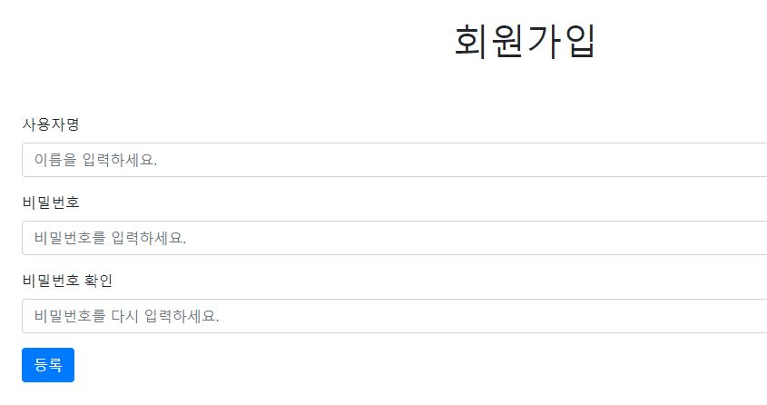 여기까지는 단순하게 구현만 한거고, 실제로 서비스 개발에 필요한 예외처리는 하나도 되어 있지 않은 상태입니다. 예를 들어 비밀번호 확인하는 란이 있는데, 지금은 그 부분이 누락되어 있습니다.