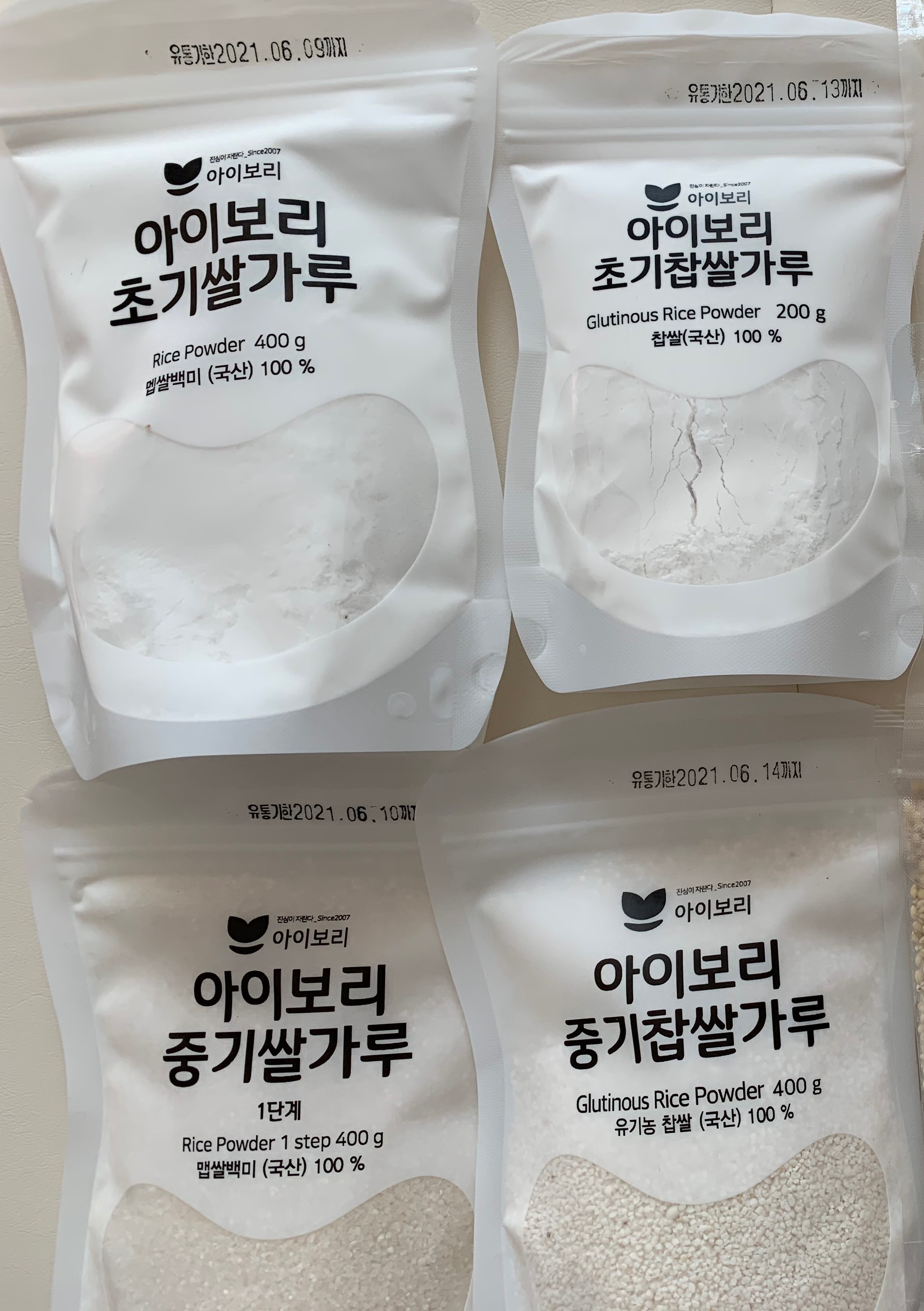 이번에 구매한 초기쌀가루와 중기쌀가루! 찹쌀가루도 같이 구매했다.